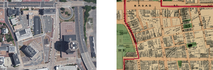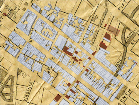 But first, back to the Richmond Eyre Crowe saw. It was a crowded, unordered, messy, place. Today in Richmond, like downtowns in medium-sized cities throughout the US, buildings are often large, monolithic structures that rise above the streets. Blocks that in the 1850s, 60s, and 70s held fifty or sixty distinct structures today are home to a single large one, bearing witness to the intertwined consolidation of corporations across nation-states and across local cadastral maps.