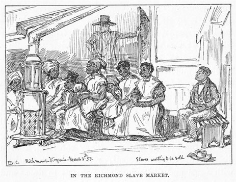 In March 1853, English painter Eyre Crowe visited Richmond. Having recently read Uncle Tom's Cabin, on his first morning in the city Crowe promptly located some advertisements for slave auctions in a local paper, asked someone at his swanky hotel for directions, and set off to witness the slave trade firsthand for himself. He didn't have to travel far--just a few blocks--before he located the nucleus of Richmond's slave trading establishments on Wall Street. He witnessed one auction, moved a bit down the road to another auction house to witness a second, and again to a third. In that third room, he took out paper and pencil to sketch a group of slaves waiting to be auctioned. Drawing these enslaved men and women rather than buying them was a suspicious and provocative thing to do. Fearing he might be an abolitionist, the dealers and buyers in the room soon threatened Crowe. While, by his own account, he didn't immediately flee lest he betray cowardice, he did display common sense; he soon if unhurriedly left, making his retreat from Richmond's slave district.