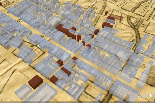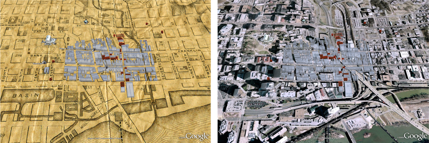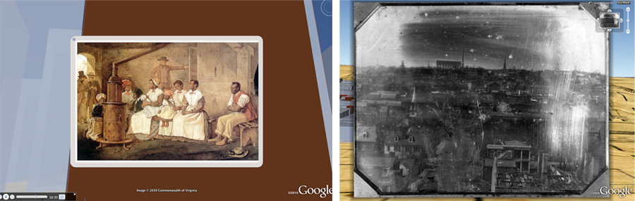 In this model daguerrotypes, photographs, and other images are being overlayed at the locations they were taken or sketched. Users of the model are able to view these 2D images within the 3D model. These images document and provide a sense of how the built environment of Richmond appeared in the mid nineteenth century; the three dimensional and data rich portions of the model, in turn, become a heuristic device that helps users explore the images and make sense of what they are seeing.